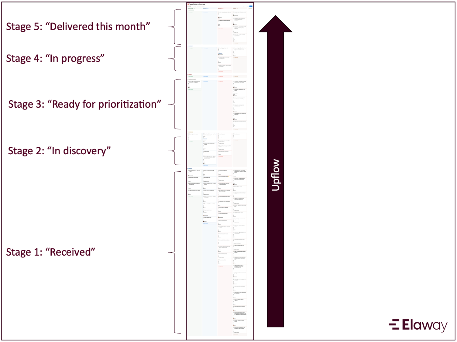 A couple of months ago—right after I wrote about how we approached this before—I began experimenting with a custom Notion setup. In this setup, problems, ideas, and requests enter at the bottom of the framework and move upward (“upflow”) until, if considered valuable enough for Elaway, they are ultimately delivered.